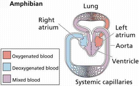 The Circulatory system of a frog consists of the heart, blood vessels, and blood. Frogs have a closed double loop circulatory system. A closed circulatory system means that the frog’s blood is contained with in blood vessels and the heart. The double loop system means that the blood goes back to the heart two times before the blood goes through the whole system of the frog’s body. There are three chambers consisting of one ventricle and two atria. The ventricle pumps blood through a single artery (truncus arteriosus) witch distributes blood thought the body. Oxygenated blood coming back to the heart from lungs enters the heart into different atria than the de-oxygenated blood does coming from the body capillaries. The valve helps to keep blood from only mixing as minimally as possible. The valve directs the oxygenated blood to the aorta, which will leave heart and go to the body capillaries and the deoxygenated blood out the pulmonary vein and to the lungs. Oxygenated and non-oxygenated bloods still mix, because Frogs lack a septum that would separate blood. The Frog's circulatory system works is because frogs do not need as much oxygen rich blood in their body because they are getting oxygen from two sources, their lungs, and through their skin. Both oxygen and carbon dioxide are able to transfer through the skin of frogs. Another reason why their three chambered heart works for frogs is because frogs are ectoderm's which means the maintain their body temperature externally and this requires a lot less oxygen.